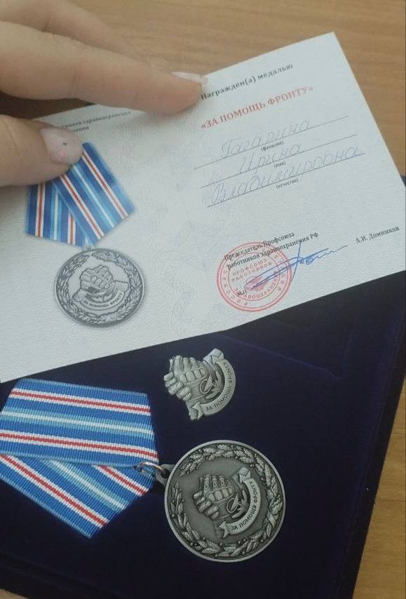 Награду «За помощь фронту» получила заместитель директора по воспитательной работе в Читинском медицинском колледже Ирина Гагарина. Она помогает бойцам на СВО вместе с коллегами и студентами. Награждение прошло на заседании Профсоюза работников здравоохранения.
